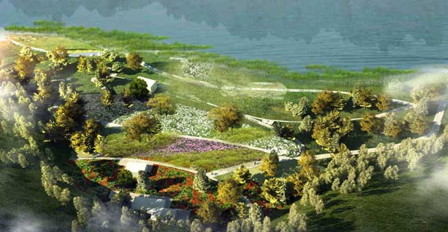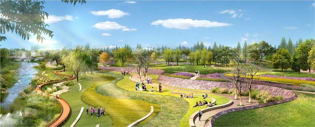 项目简介:项目位于郑州市二七区,金水河西岸,郑密路东。东西向宽度100-300米,南北向长度约1200米,一期建设用地约为10.8公顷(162亩)。本设计基于对基地现状分析的结果,对景观诸多因素如地形、交通、岸线、开放空间、景点开发等做出考量与设计。充分利用环保的、可持续发展的有效设计手法,反映不断增长的人类活动与生态资源和谐融合的需求。满足人类对自然环境和自然体验的渴求和向往;重新梳理整合了基地地形、基地植被、生物多样性、水资源和休闲娱乐空间,将基地现有景重塑成郑州市未来可持续发展的滨水景观新岸线。创造出符合该设计区域城市定位的新时尚生活方式。